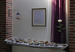 In onze kerk hebben we een heel bijzondere plek. Ga er maar eens kijken. Je vindt deze plek tegenover de ketting met doopkralen. Het is een plank en op deze plank liggen allemaal stenen. Er brandt een kaarsje.