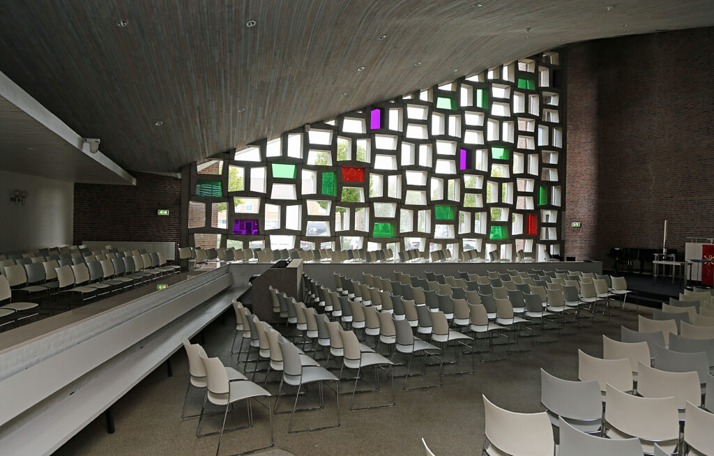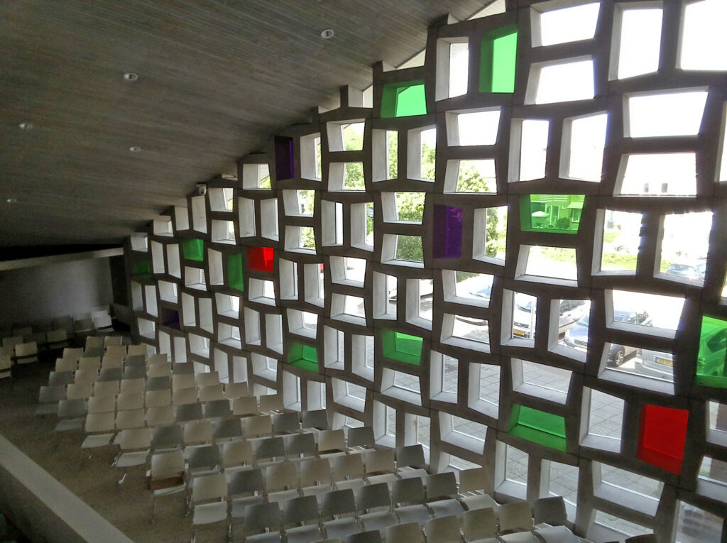 De vloeren in het gebouw die op straathoogte liggen, worden beschouwd als het leven van alle dag. De kuilen in de Kerkzaal en de Hofzaal, de diepere lagen, zijn een vorm van bezinning. Zo kun je in de Kerkzaal en de Hofzaal een combinatie van wereld en levensbeschouwing zien. De muur achter het liturgische centrum heeft een ronde vorm. Dit geeft de oneindigheid weer. Het in deze muur gemetselde plateau waarop het bord en de beker voor het Heilig Avondmaal staan, zijn symbolen voor. Heelal, Leven, Geloof. Vanuit het liturgisch centrum gezien is het dak één grote golf. Water, zee, golven hebben een negatieve betekenis: ontembaar element van de onvoltooide schepping, een overblijfsel van de zondvloed. Positief gezien staat de zee ook symbool voor Leven en maakte de zendingsreizen van Paulus mogelijk. De ramen in de Kerkzaal hebben de vorm van een boek en in totaal zijn er 66 ramen. Zij vormen de Bijbel, met daarin de 66 Bijbelboeken.