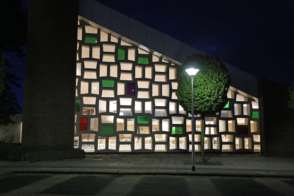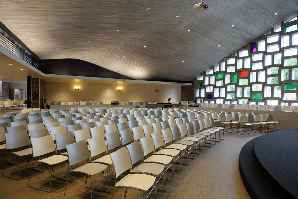 De hoofdingang werd gerealiseerd op het oosten waar de zon opkomt. Het licht van de nieuwe dag komt hier als eerste binnen. Het is ook een verwijzing naar de Schepping en de Opstanding. Het rouwcentrum was voor de verbouwing aan de noordkant; nu is daar de ruimte voor de oppasdienst. Waar nu het rouwcentrum is, waren zalen voor kleine bijeenkomsten.